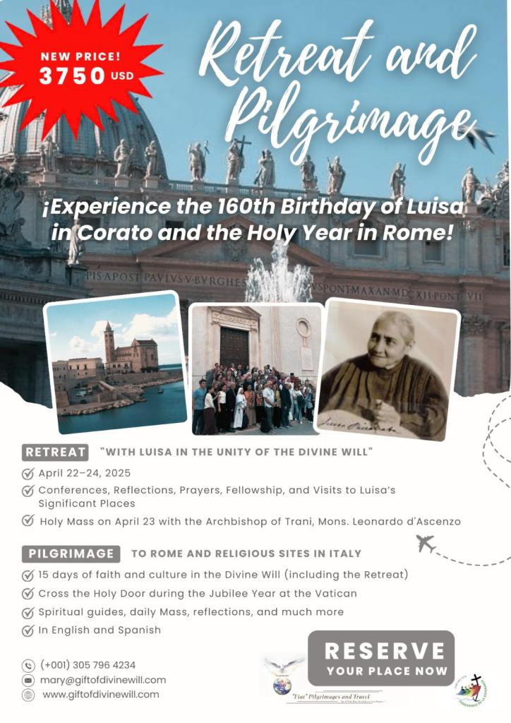 Blessings all. The upcoming pilgrimage to Italy for the Jubilee year and for Luisa’s 160th birthday has been shortened by 3 days and the price reduced by $800 USD.